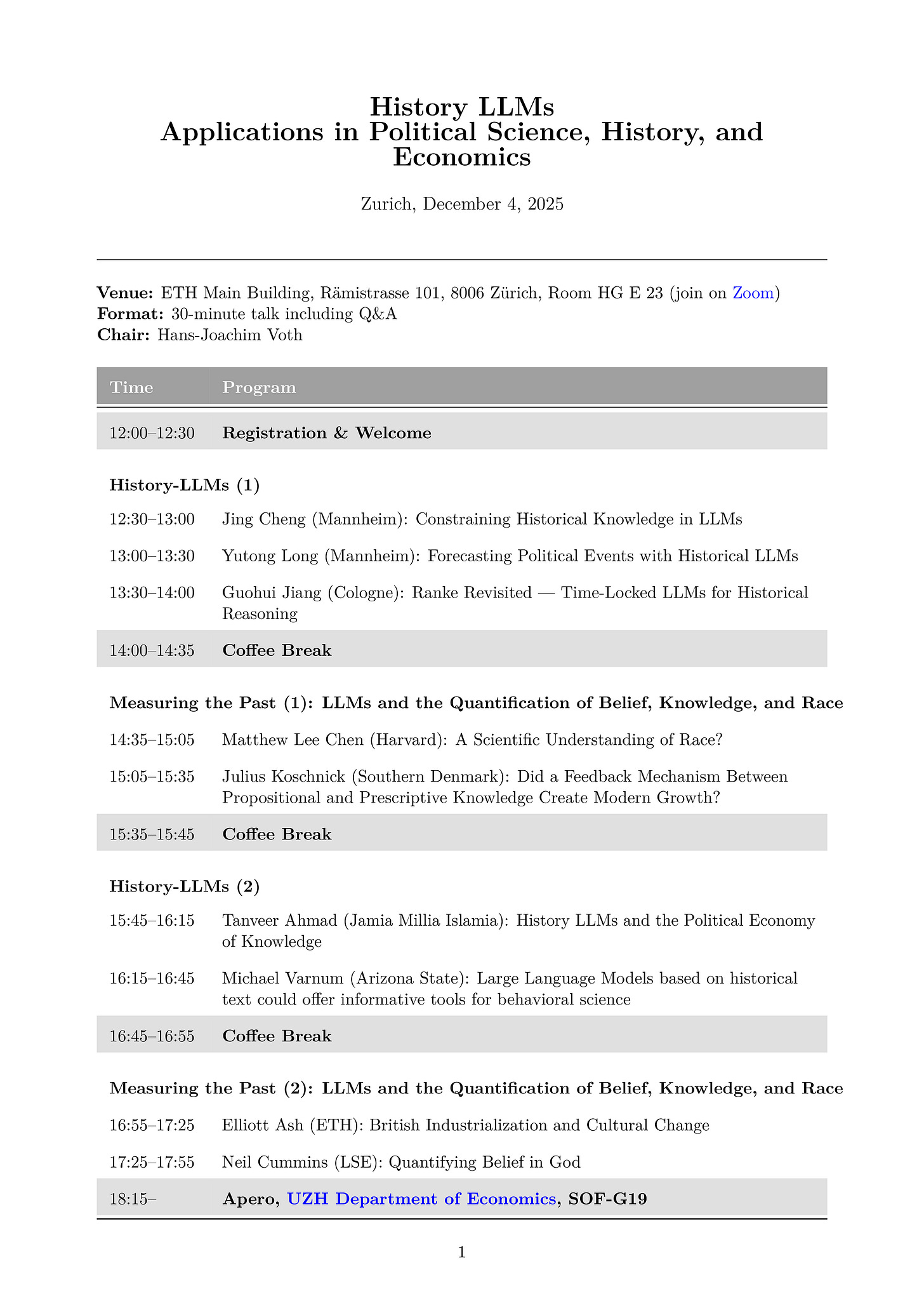With this in mind, we organised a Workshop on History LLMs at the University of Zurich and ETH Zurich in early December. The workshop brought together a wide range of researchers from history, economics, and computer science (CS) to reflect on the current state of the field and to discuss where it may be heading.