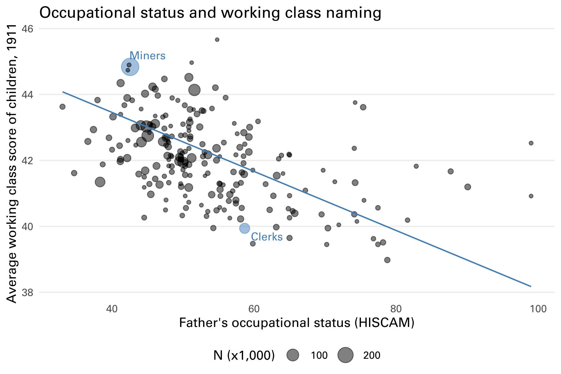 The names people gave their children also reflected their class positioning. Figure 1 plots the average score for children recorded in the 1911 census against the status of their father’s occupation (using scores from the HISCAM). In general, fathers in high status occupations gave their children less working class names. But the observations off the regression line are interesting. Clerks were not particularly high status, but did not work with their hands and were considered lower middle class. They tended to give their children less working class names than other occupations of the same status.