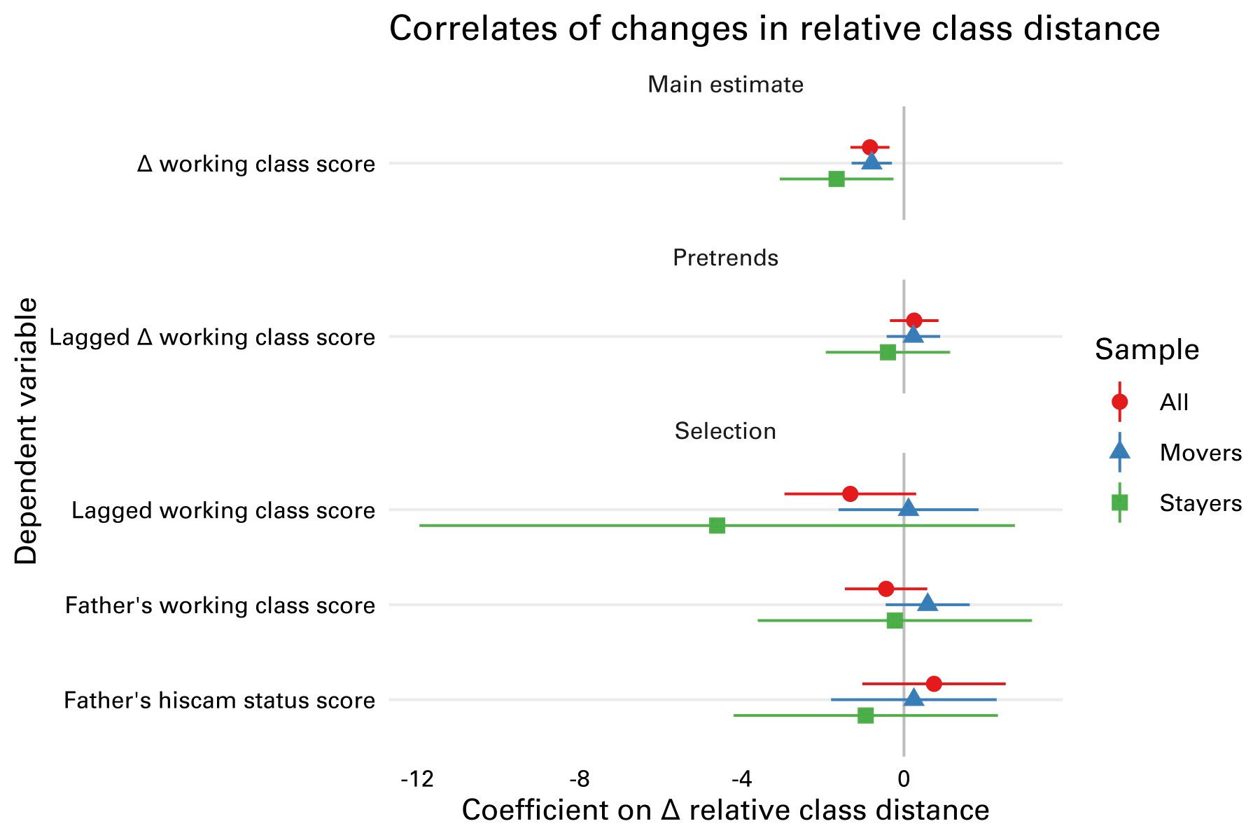 In the top row of Figure 2, we look at the relationship between the change in working class scores between two children in a household, and the change in the family’s relative distance to the working class in the birthplaces of the children, relative to the upper class. Increasing distance to the working class corresponds to a shift away from working class identity. Going from the 5th to the 95th percentile of the relative class distance distribution corresponds to a decrease in working class identity of around 11% of the difference between Oxbridge- and non-university-educated MPs. If we separate out families where the two children were born in different locations (”movers”) and those where both children were born in the same location (”stayers”) we get similar estimates. This is reassuring in that it suggests that the mechanism we want to study, and not something else that could be causing households to migrate, is driving our estimates.