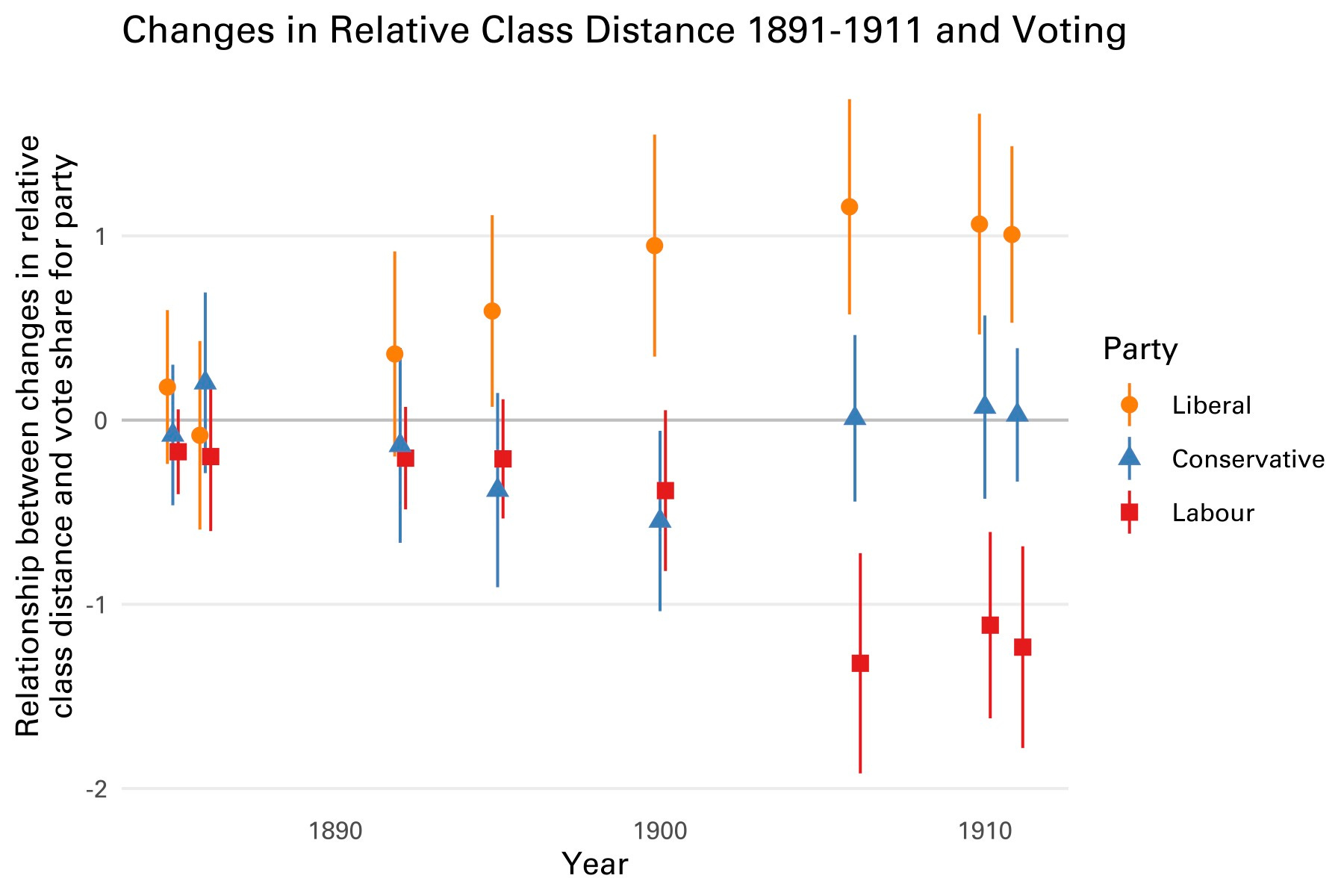 In Figure 3 we examine that prediction. The figure shows the relationship between the change in relative class distance at the local level, 1891--1911, and voting for the three main parties in that area in successsive elections. In the 1880s and 1890s, the places that experienced increases in relative class distance were no more likely to vote for one party than any other. But between 1892 and 1910, these places experienced a relative shift away from Labour.