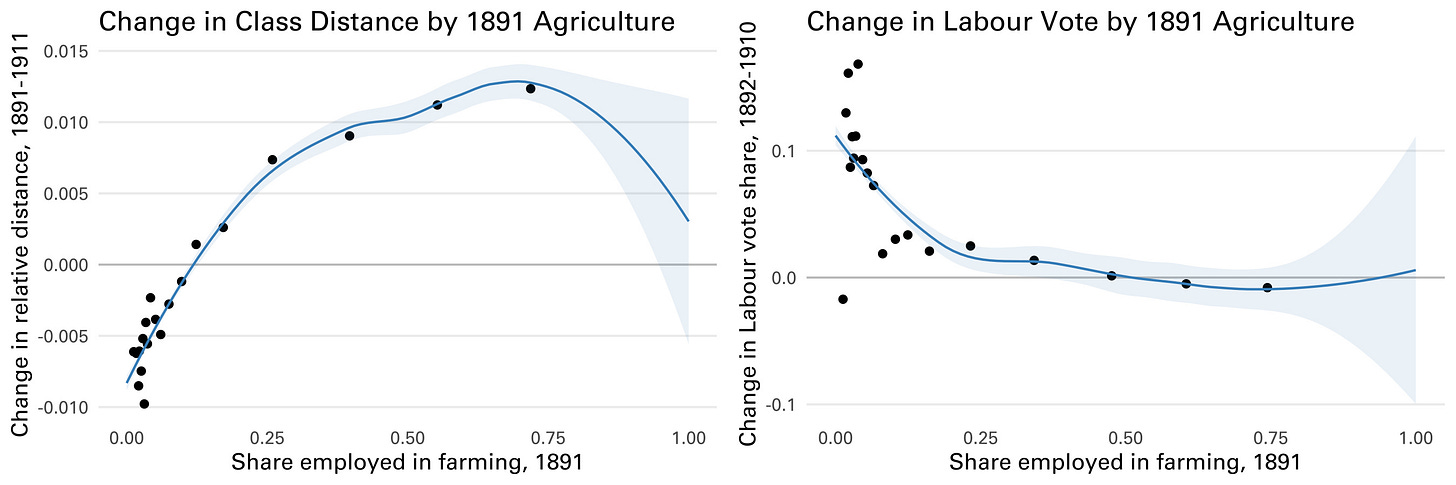 In the left panel of the figure below, we plot the (binned average) change in class distance between 1891 and 1911 against the share of employment in agriculture in 1891. Rural areas experienced an increase in relative class distance, but urban aread experienced a decrease. In the right panel we plot the change in voting for Labour against agricultural employment. The Labour Party gained votes in those urban areas which had falling class distance. Industrialization and migration first delayed and then accelerated the formation of urban working class politics in the UK.