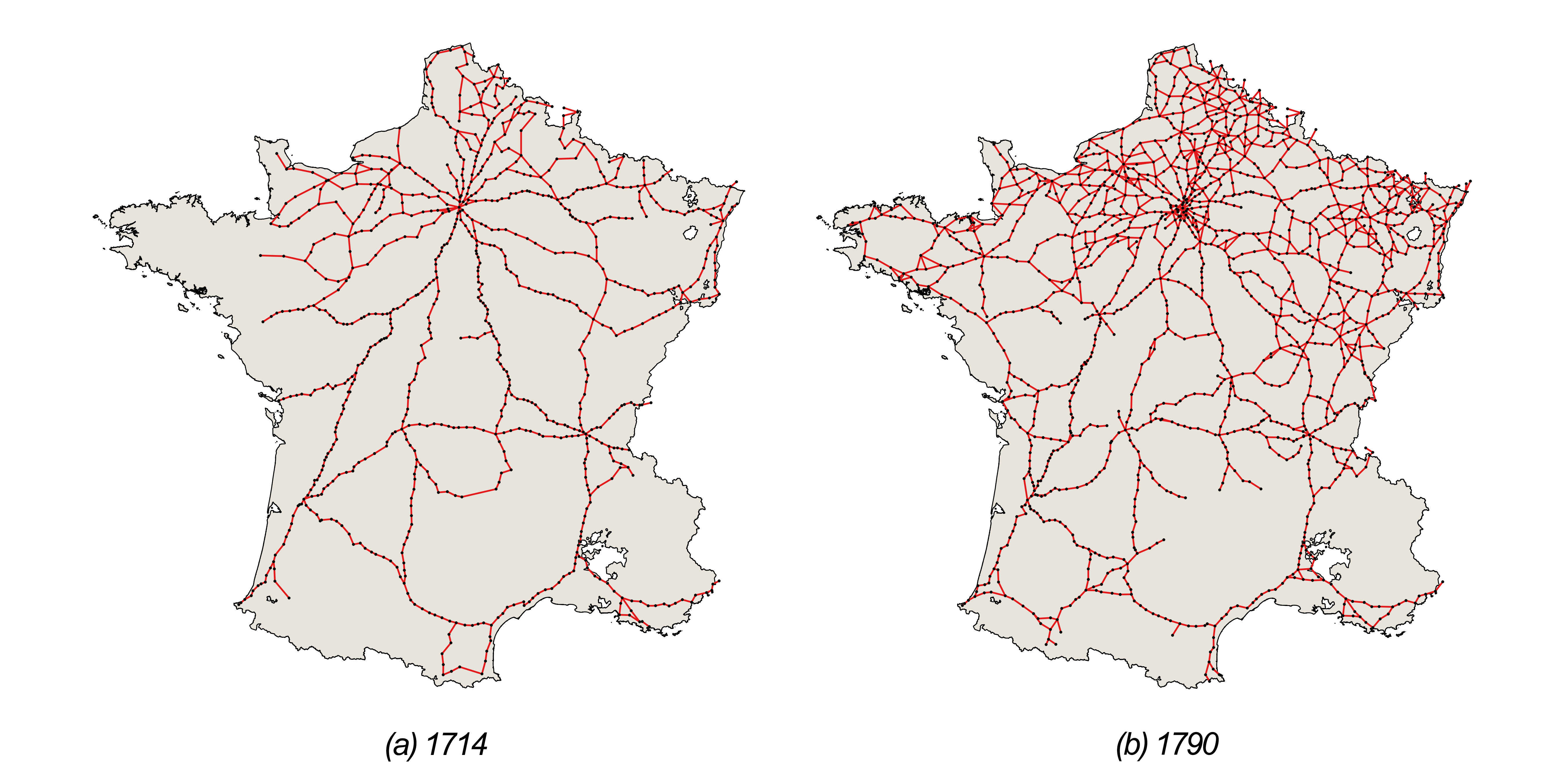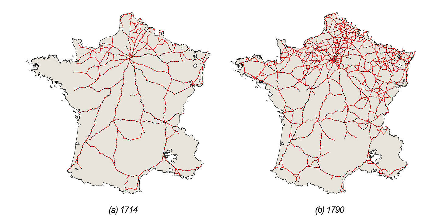 France was caught in precisely this dilemma throughout the eighteenth century. A central element of the monarchy’s state-building efforts was the expansion of the horse-post relay network, which nearly doubled in size over the period (see image).