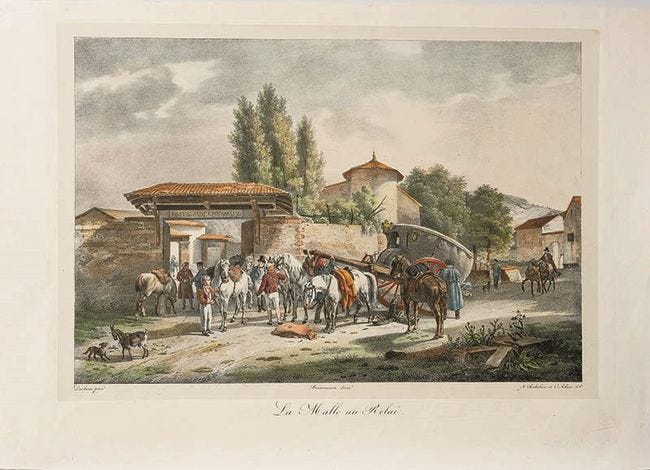 With cars, trains, and telephones still far in the future, these relays established attended lodging quarters and a well-prepared set of fresh horses for messengers carrying information for the royal administration where there had previously been no support. The horse post represented one of the primary means of consolidating the hierarchical French state’s informational capacity as it sought to rule and control a fragmented territory. Located at the entrances to towns or at rural crossroads, horse-post relays were prominent waypoints, comprising stables, lodging quarters, and oftentimes a tavern. Young, sharply dressed horse-post messengers flashed through the countryside between relays (see image). The wealthy local notables that came to staff these waypoints as postmasters effectively doubled as intelligence agents on behalf of the central administration by monitoring passengers and communicating information with regional officials.