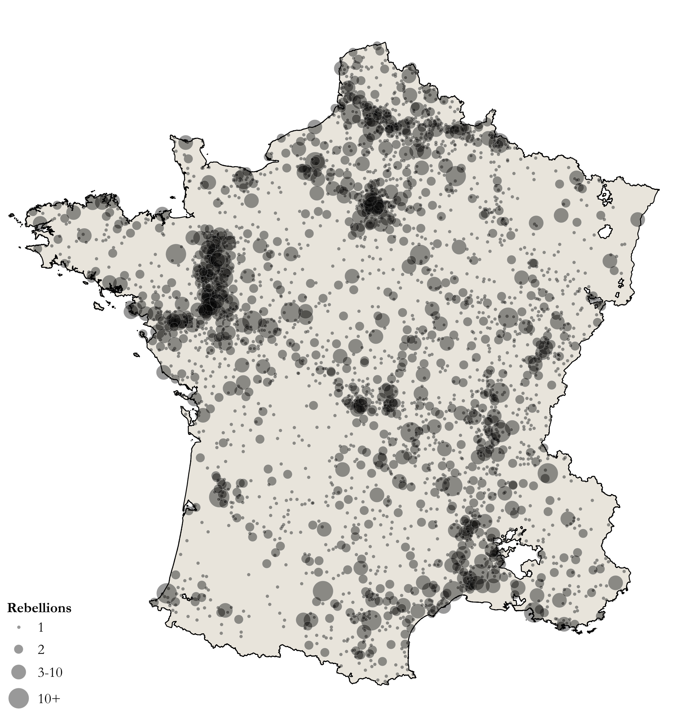 The French countryside simmered with discontent in the century prior to the French Revolution. As the monarchy sought to assert greater authority and control across its territory, building its informational and infrastructural capacity to levels not previously seen, it was met with grievances and rebellion both far and wide (see the map below). Commoners targeted symbols and agents of the royal authority, protesting tax collection, military conscription, and what they perceived as arbitrary or the unfair pursuit of justice. These rebellions would ultimately help set the stage for the French Revolution, one of the most influential and heavily studied political events of the last 250 years.